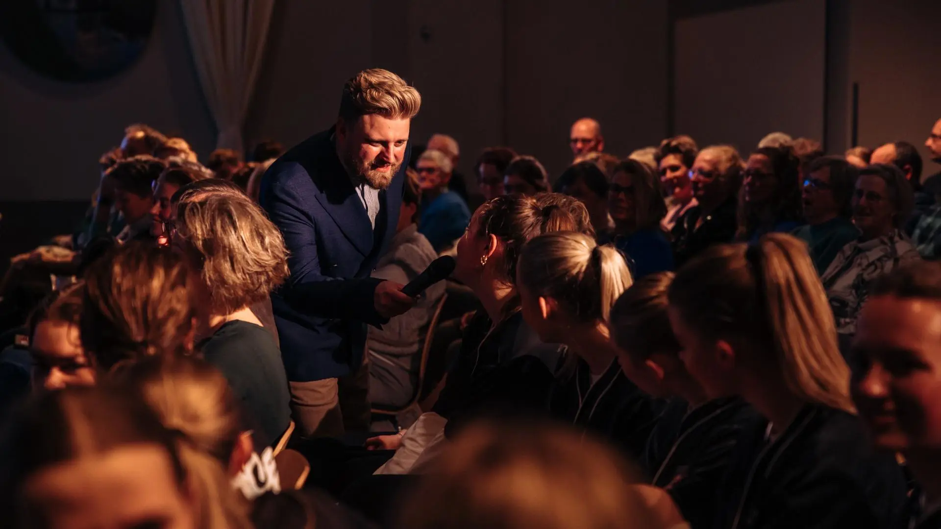 - Hij stemt af op het publiek én de sprekers, en beweegt met de dynamiek van het moment
